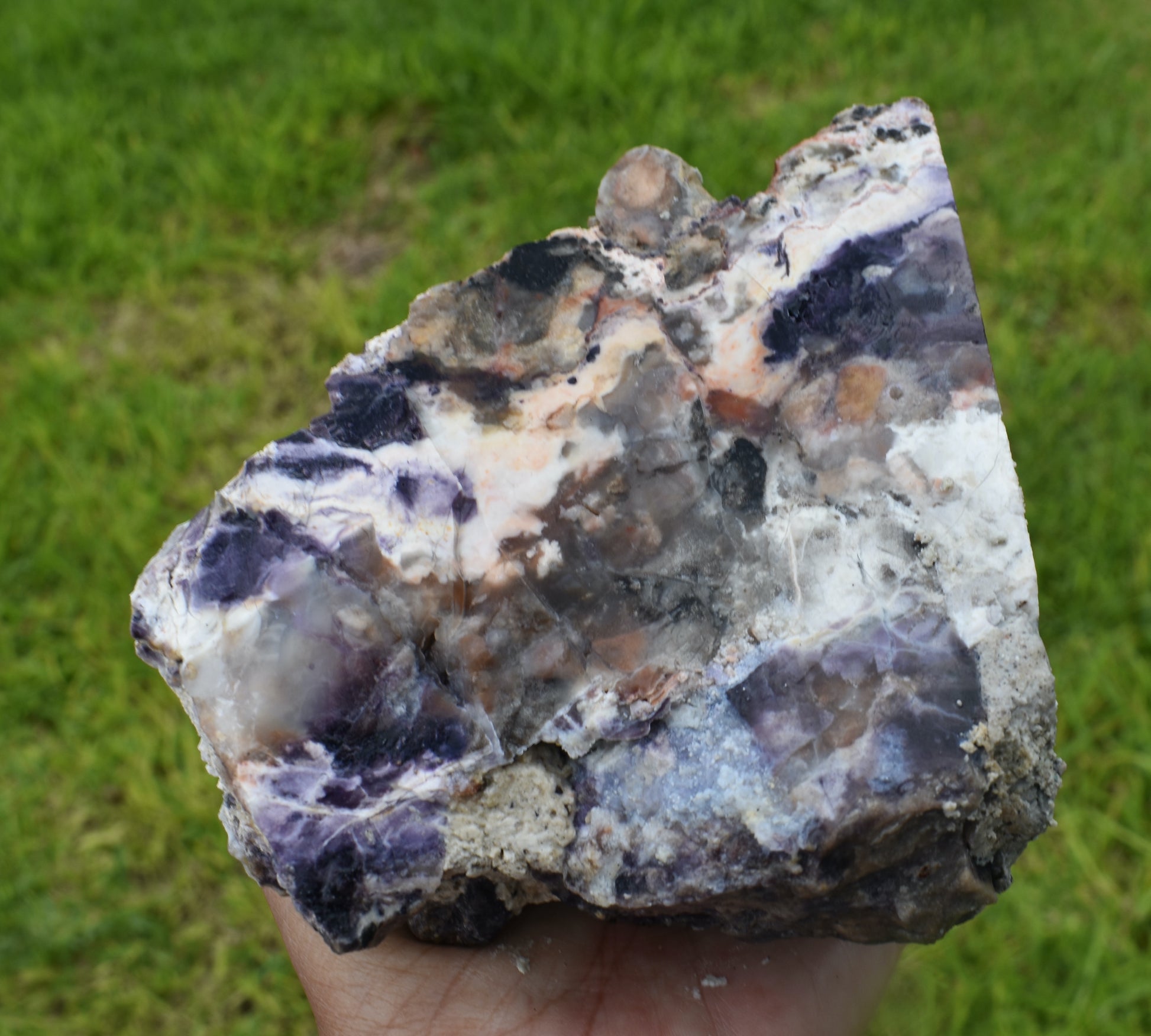 Tiffany Stone is composed of varying combinations of minerals such as bertrandite (beryllium silicate), beryl, calcite, chalcedony, cobalt, dolomite, fluorite, manganese oxide, rhodonite, quartz and zinc. The purple color that characterizes Tiffany Stone was created by fluorine gases, while the distinct black-colored veins were caused by manganese oxide; all of which were sealed within the sedimentary layers, becoming opalized over time.